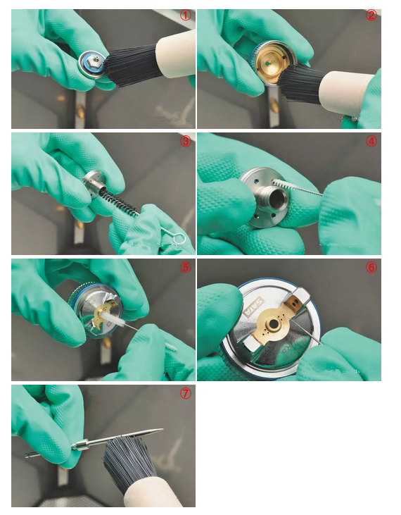 使用噴槍后清洗不干凈,導(dǎo)致風(fēng)帽霧化孔被堵塞;浸泡噴槍,脫落的油漆殘?jiān)M(jìn)入噴槍的空氣通道和風(fēng)帽的霧化孔,劣質(zhì)溶劑還導(dǎo)致槍體腐蝕。