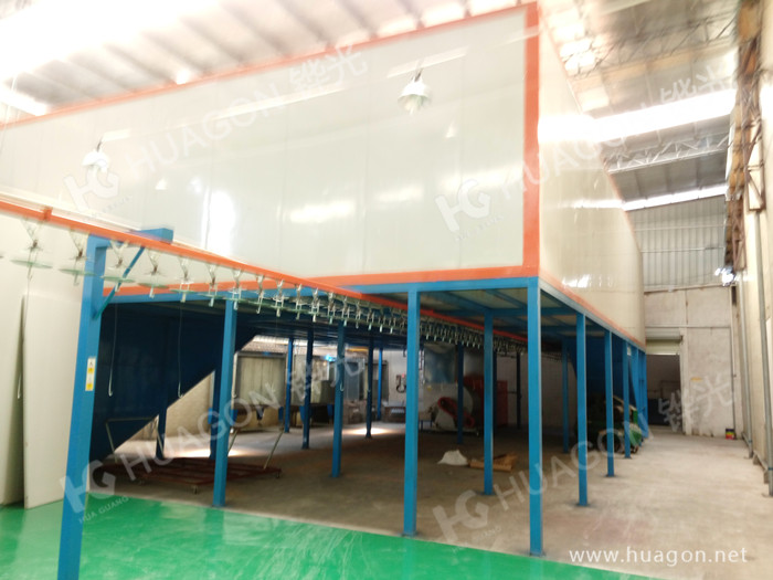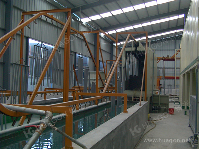 上料-預(yù)脫脂-強制脫脂-表調(diào)-磷化-噴淋-脫水-多任務(wù)站手動/自動噴涂-靜置-烘烤-冷卻-下料